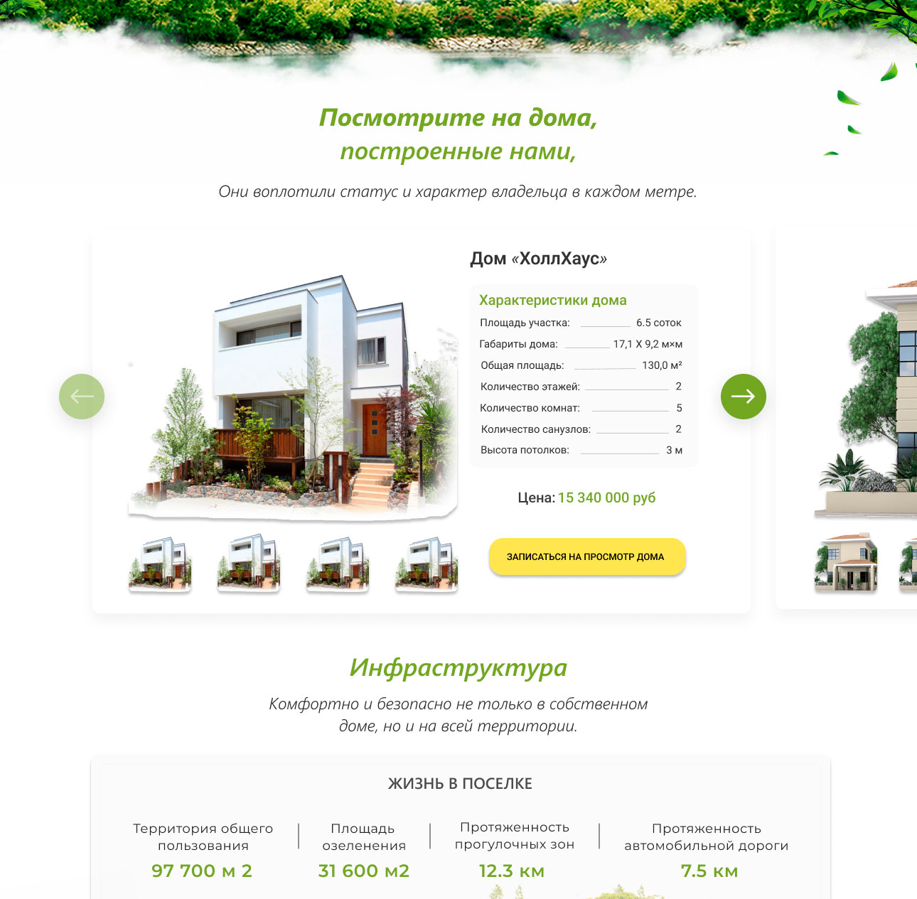 – Разделы с планами домов, условиями покупки, контактами